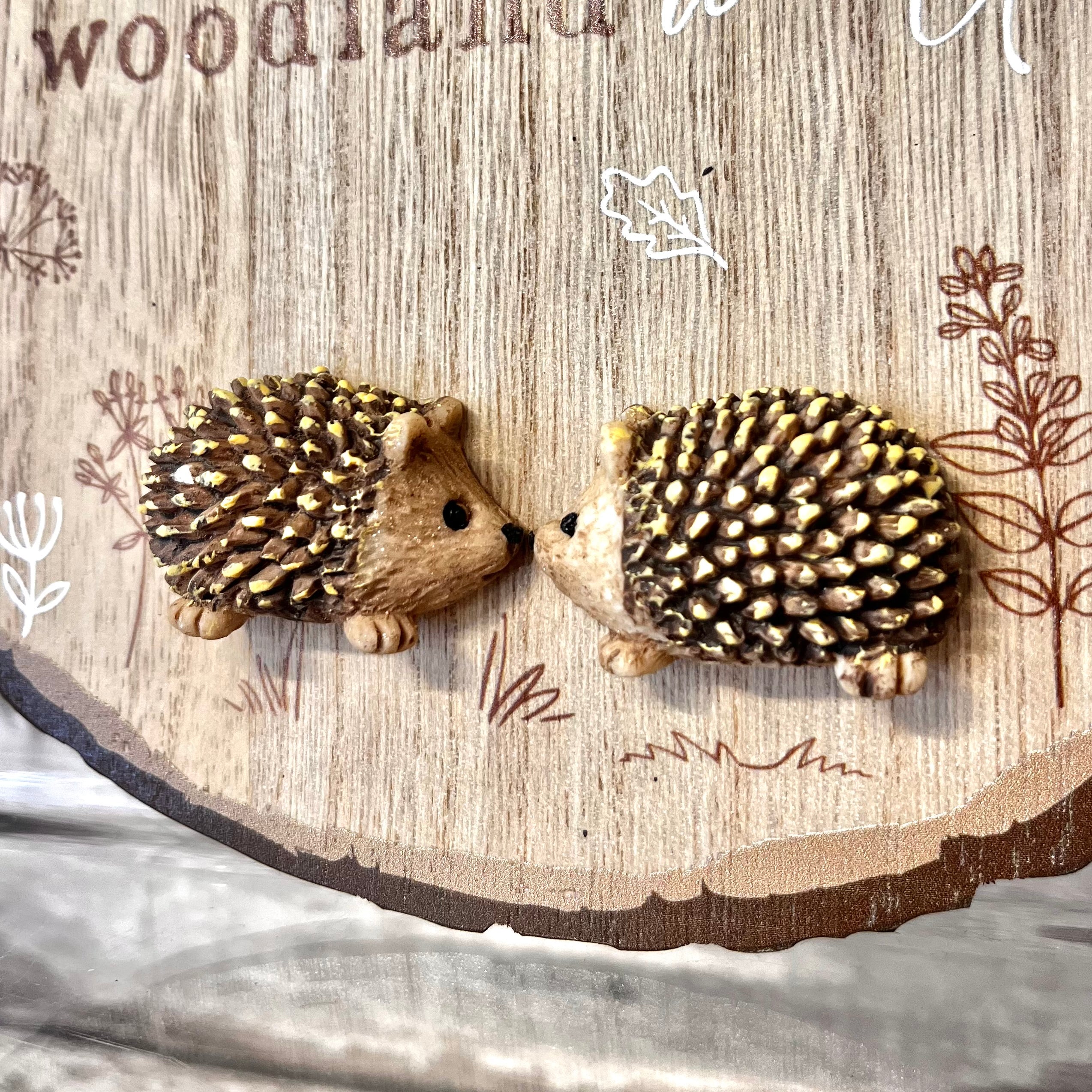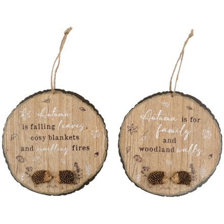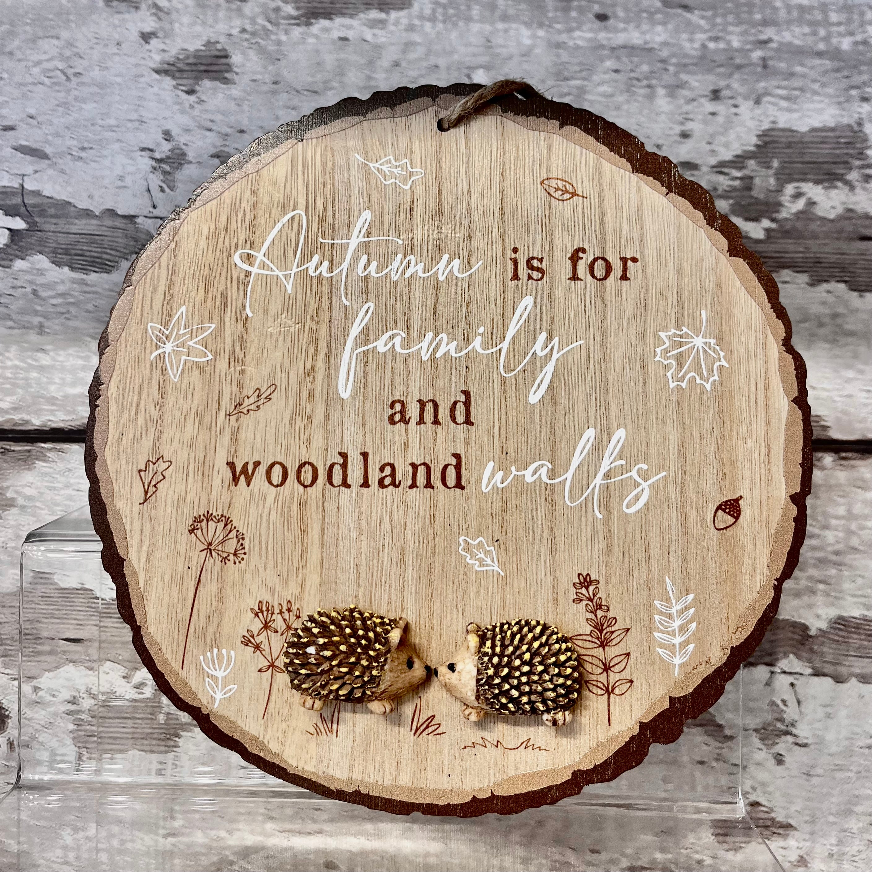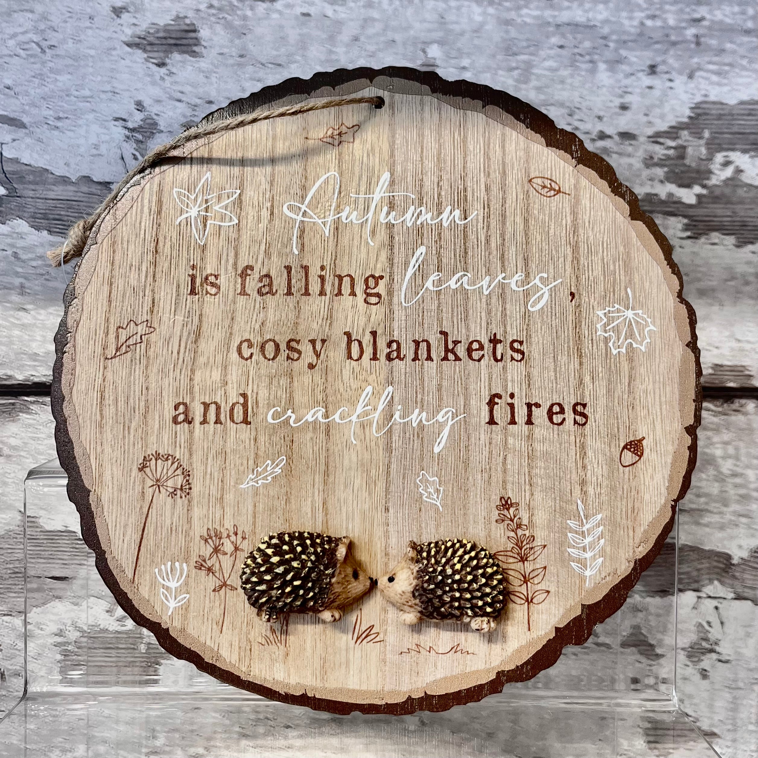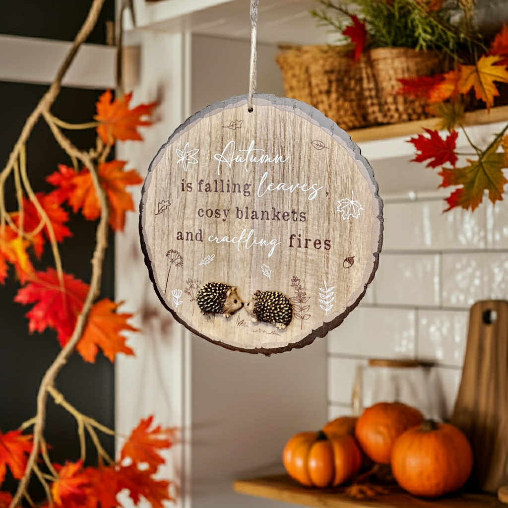 This Autumn round hanger is crafted from quality wood and features a charming brown design adorned with an autumnal hedgehog motif.