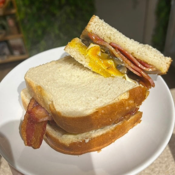 3 rashers of crispy smoked bacon, an egg, and mushrooms in a choice of white or brown bloomer bread.