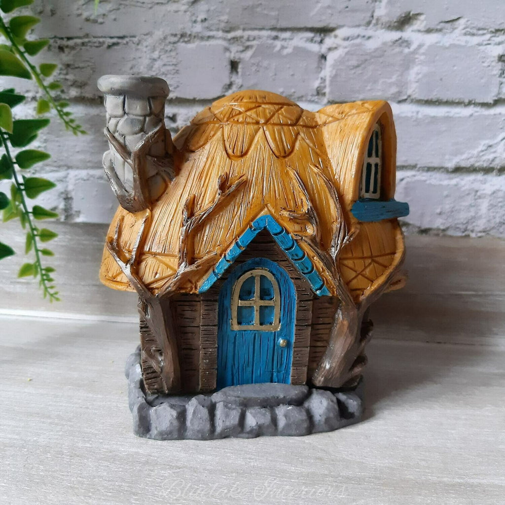 Welcome to 'Buttercup Cottage' A charming replica of a cute cottage designed to be used as an incense cone burner, perfect for setting the scene on a cosy night in. Once the cone is placed inside and lit the smoke comes out of the chimney making it look like a little log fire is burning within. A little fairy home made from resin with intricate detailing making this a great piece of decor for the Winter Season home.