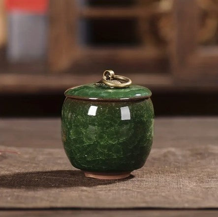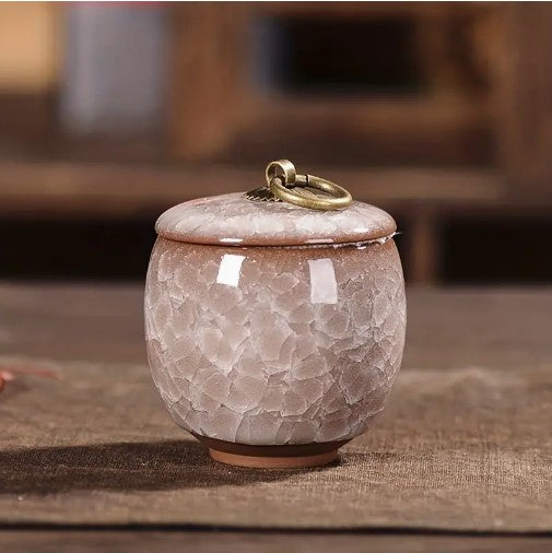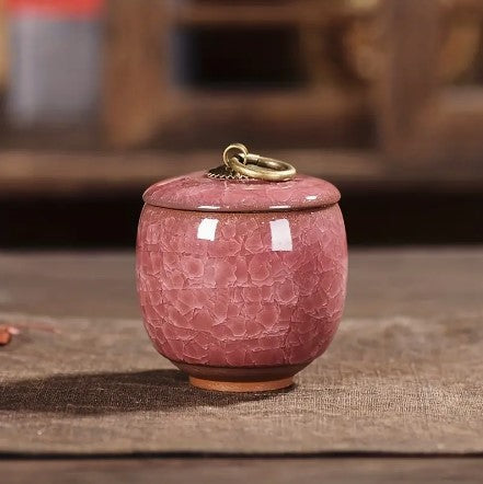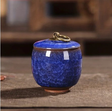 Smooth and durable small ceramic urn available in a variety of beautiful colours. Finished in a stunning crackle design with a sturdy firm bottom, tight sealed lid and copper metal pull ring.