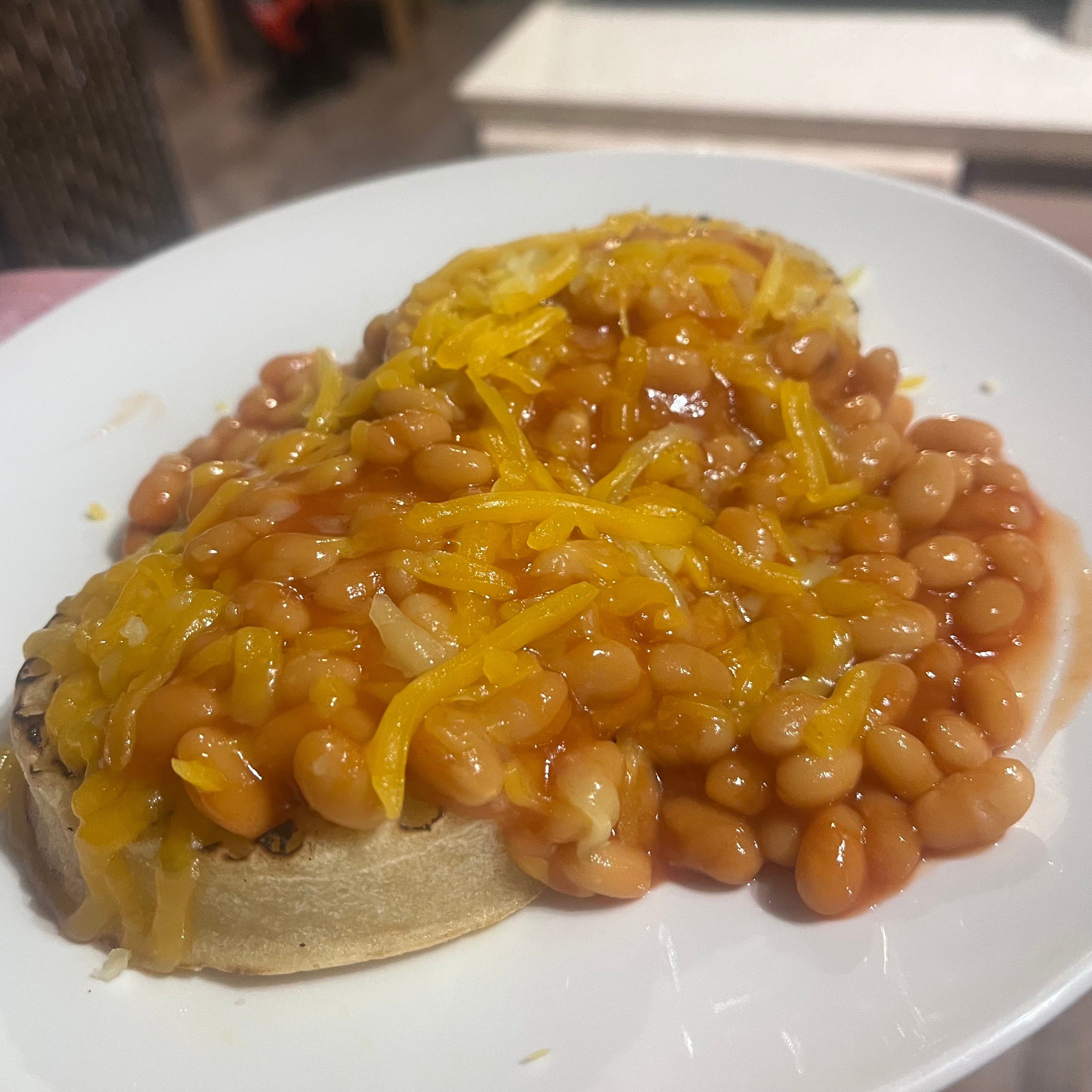 Toasted crumpets topped with cheese, beans, and a sprinkle of more cheese!