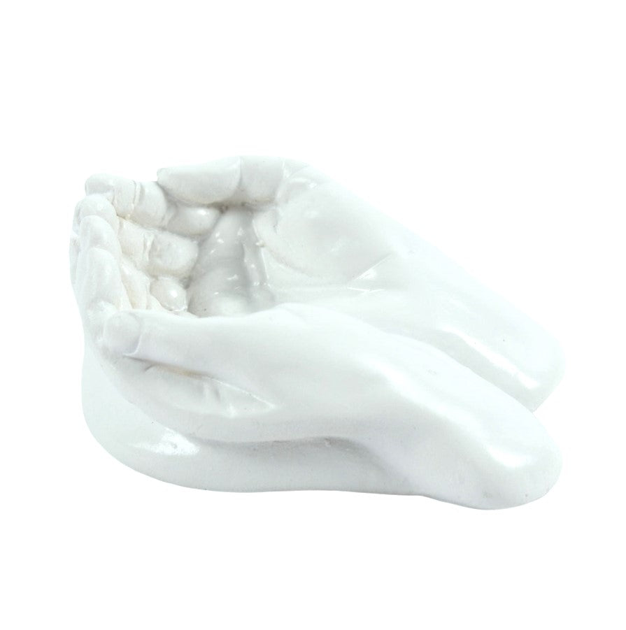 An intricate white resin ornament of cupped hands that are perfect for holding a tealight, trinkets, tea-light candle or tumble stones and crystals.