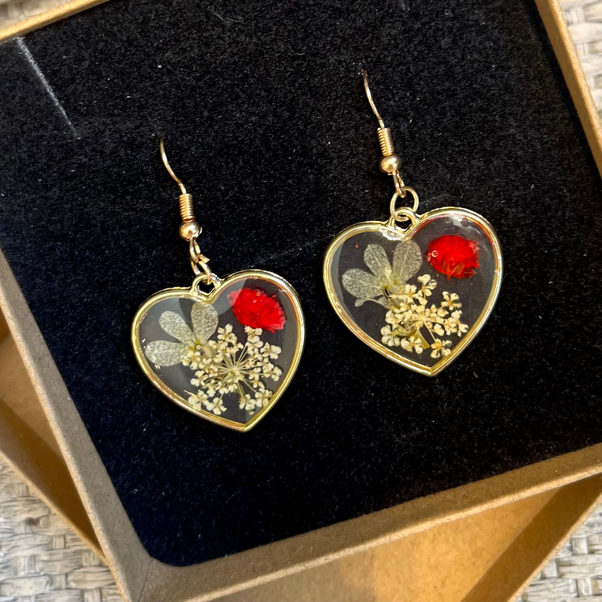 These dried flower heart shaped earrings are a beautiful and dainty accessory that will add a touch of nature to your outfits.