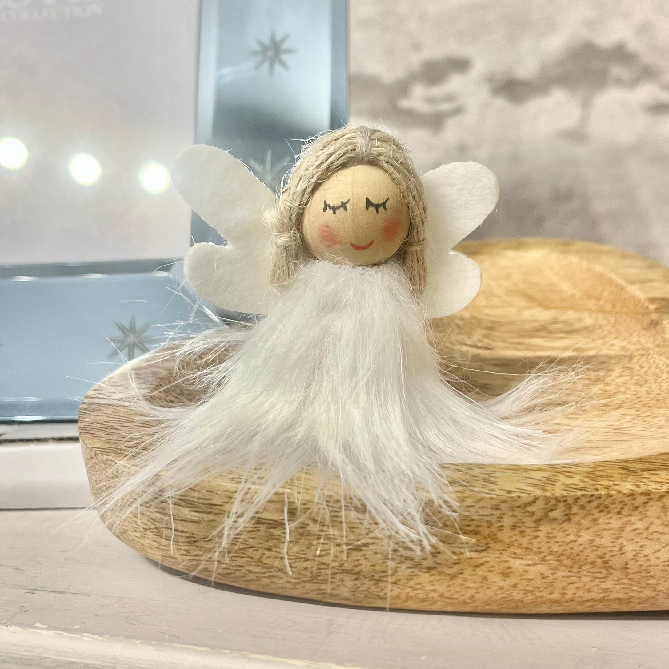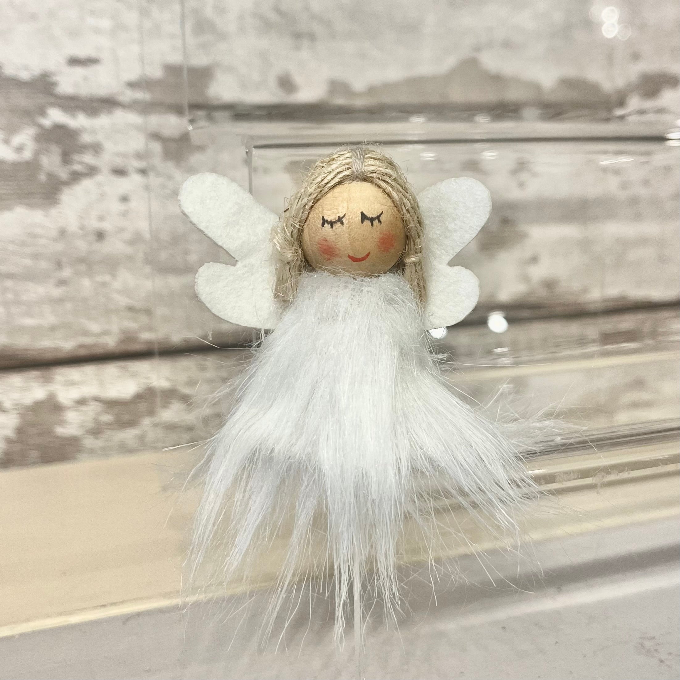 A sweet little decoration, featuring a fabric angel with a white fur body and white fabric wings.