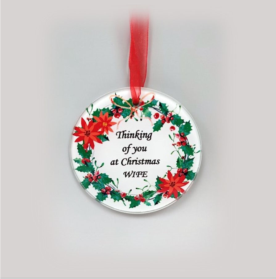 Featuring a Colourful Christmas Wreath design on a white base - this would make a suitable gift for a Wife or a remembrance piece for her this Christmas Time.