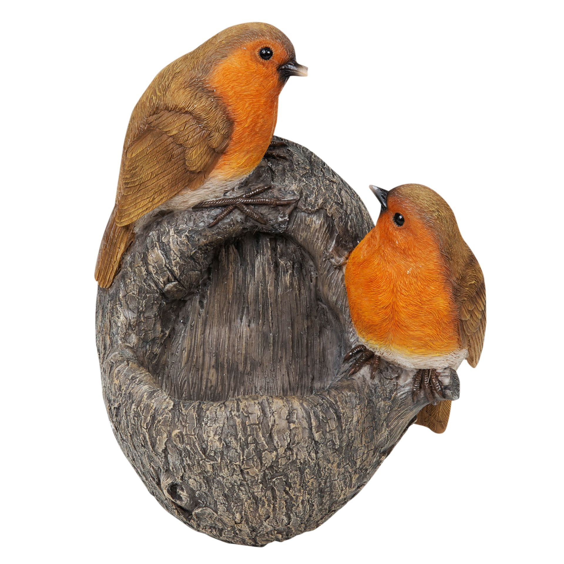 This wonderful accessory features a realistic bark finish bowl which can be filled with seed. Two intricately detailed hand painted robin redbreasts perch on the top of the ornament.