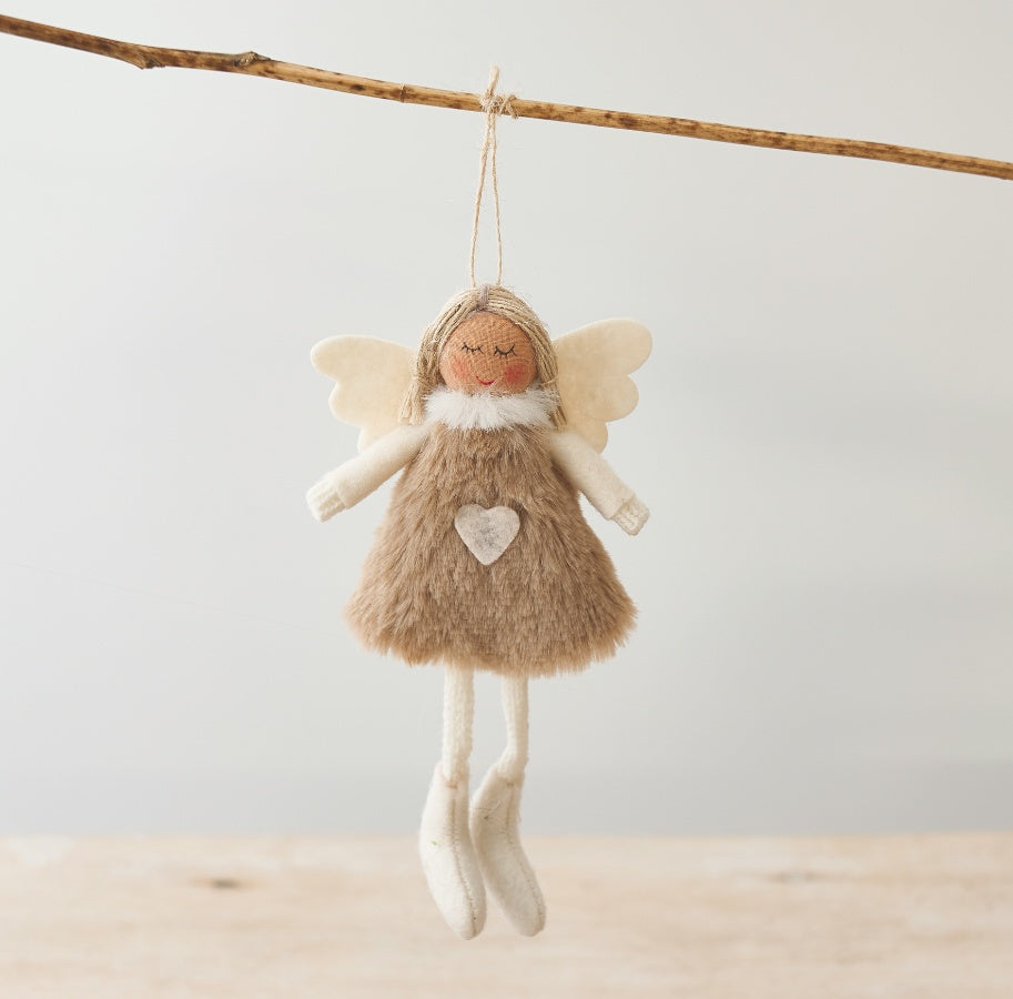 A charming hanging decoration, featuring a neutral toned angel with white wings and knitted dangly legs. Perfect for adding to a neutral display.