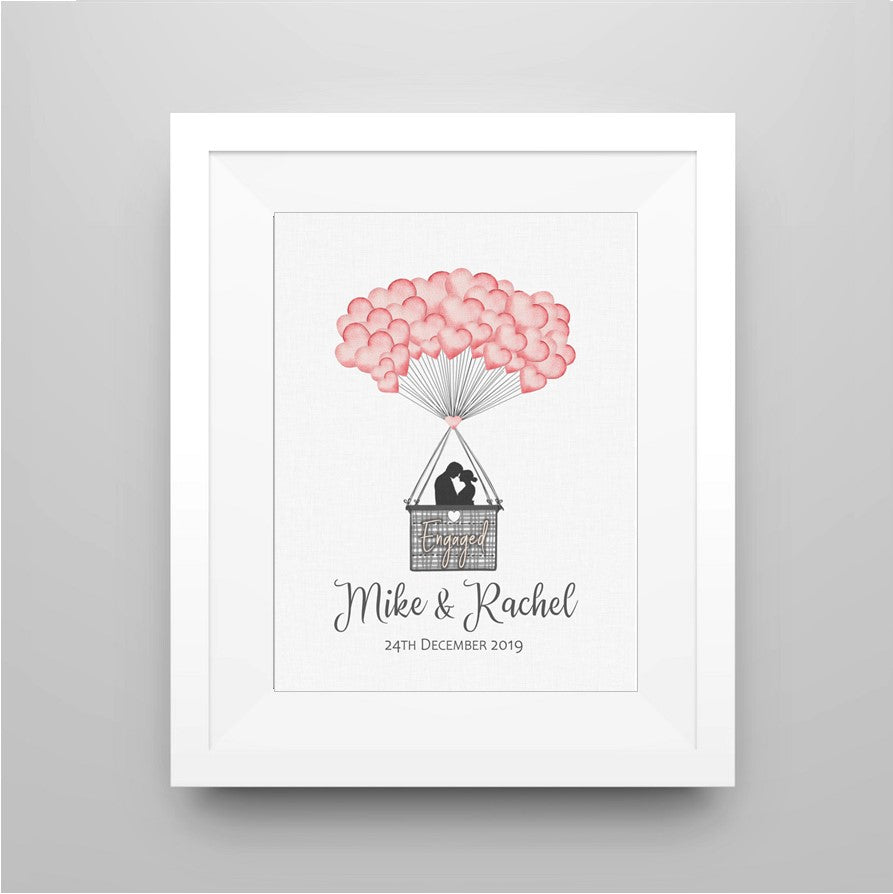 A simplistic love story designed picture perfect for valentine, engagement, wedding, anniversary featuring a large hot air balloon of hearts that transports a man and woman on their love adventure. An eye-catching piece capturing the story of a loved-up couple.