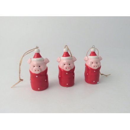 A super cute hanging decoration, featuring a pig wrapped in a festive red blanket with white polka dot decal. Sure to be a sweet addition to any home.