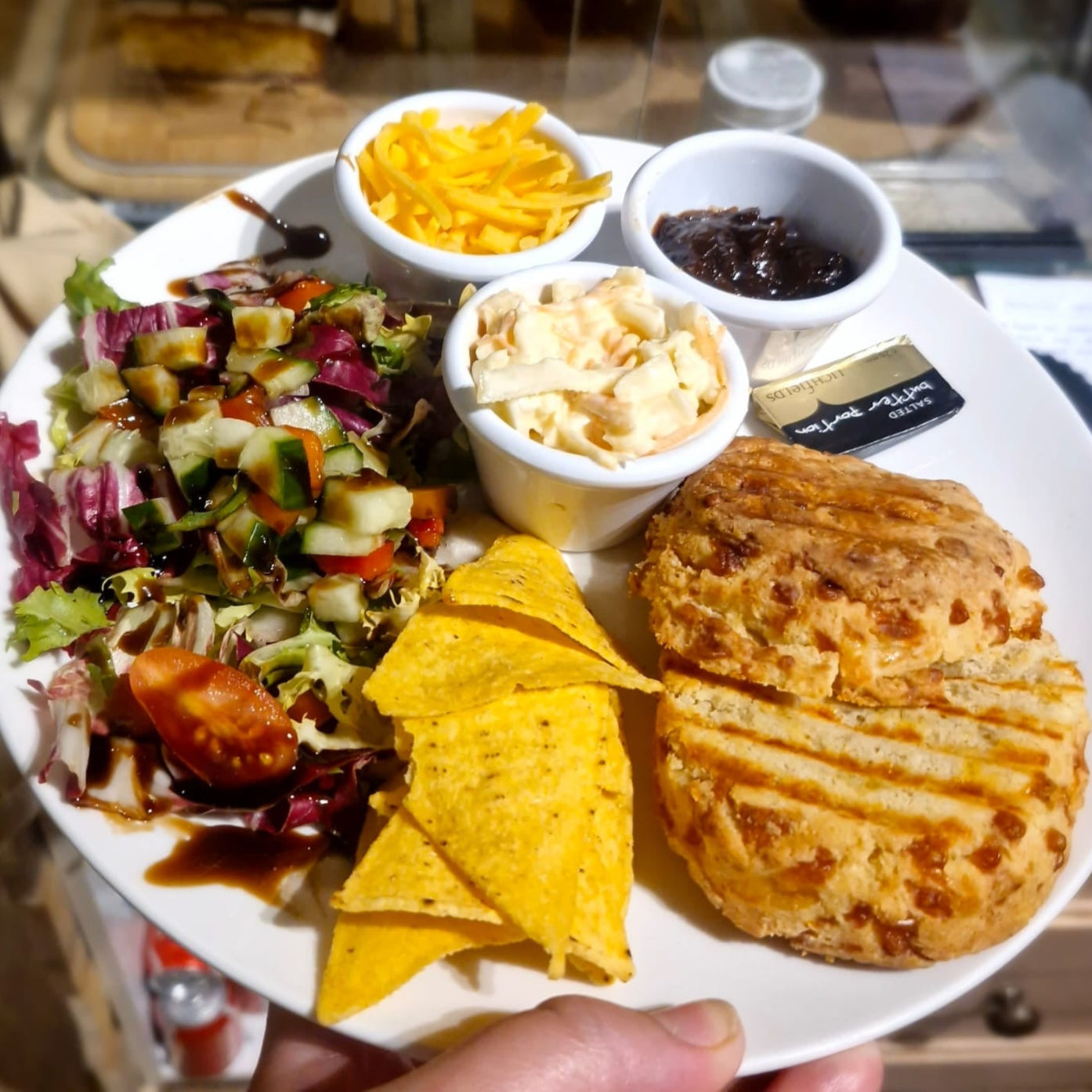 Toasted cheese scone served with pickle, side salad, cheese, and coleslaw.