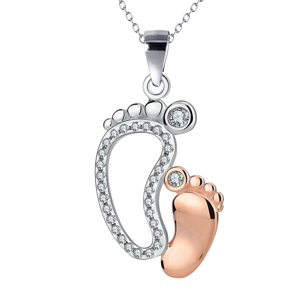 The necklace represents a mother and baby foot together with delicate chain and pendant finished in diamanté crystal and silver/rose gold colouring.