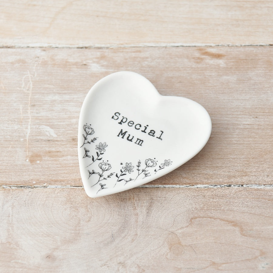 A heart shaped trinket dish with a pretty floral or heart design and Special Mum slogan. A practical and stylish sentiment gift item for mum.