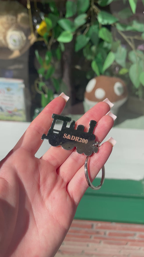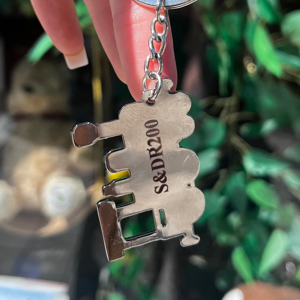 Train shaped silver keyring featuring 'S&DR200' engraved on the back.