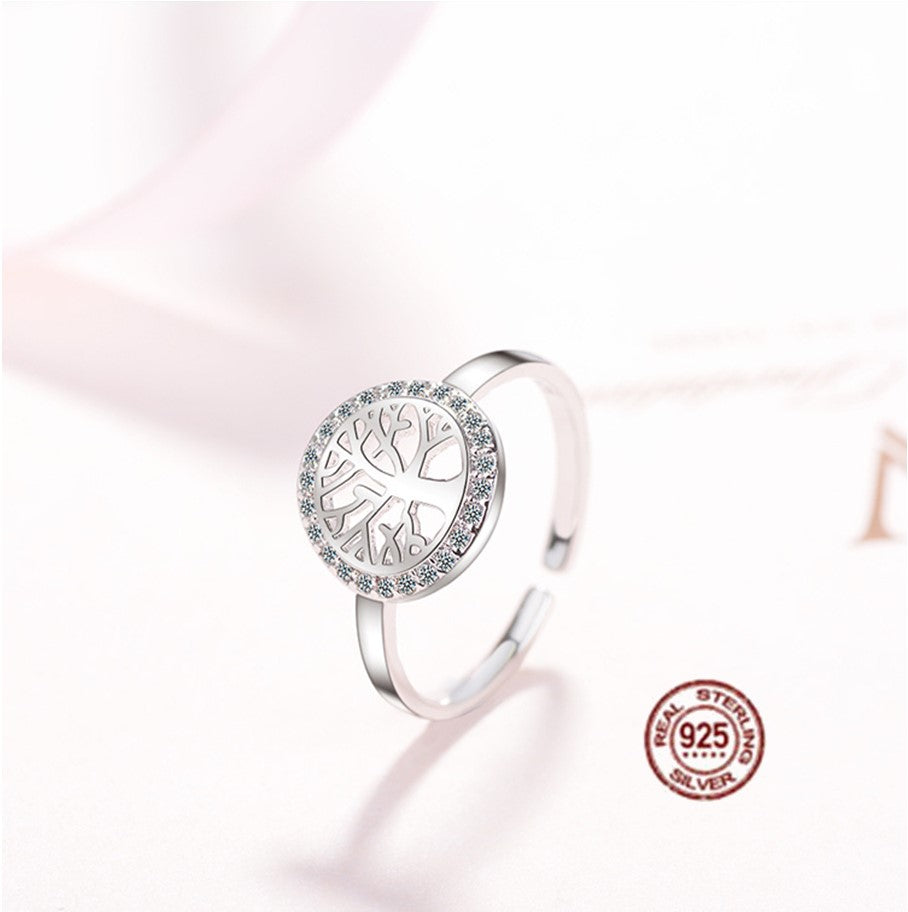 A delicate adjustable Sterling Silver Ring - S925 stamped inside. This ring features an intricate tree of life design inside a diamante circle that represents everlasting.