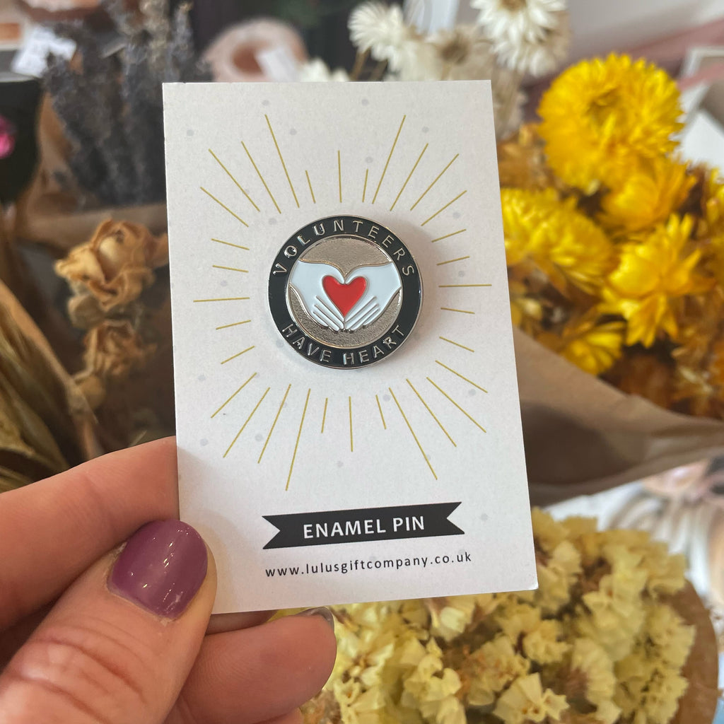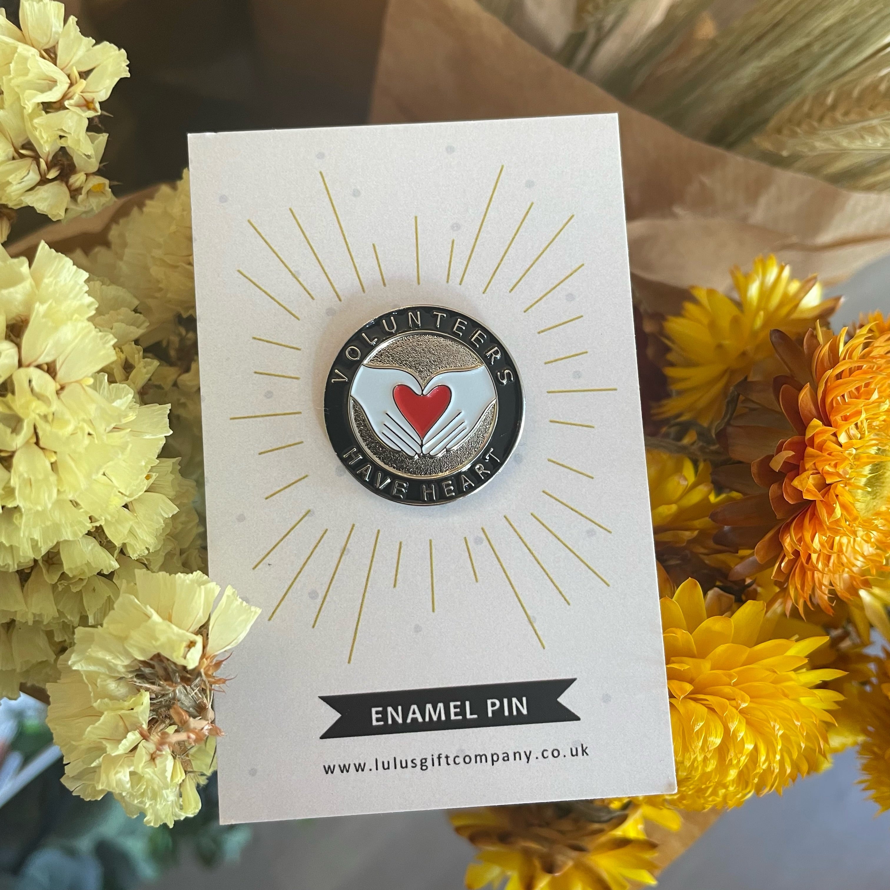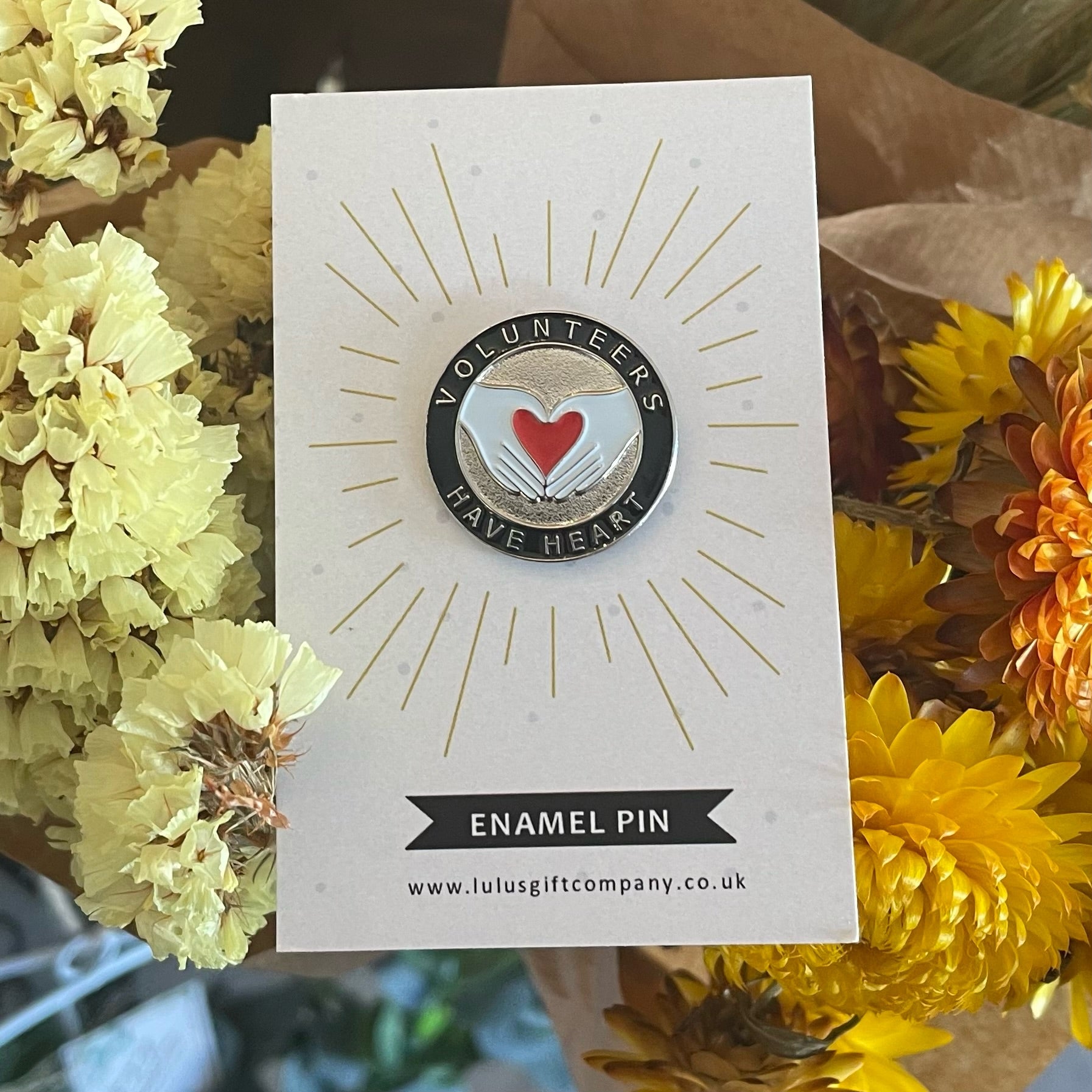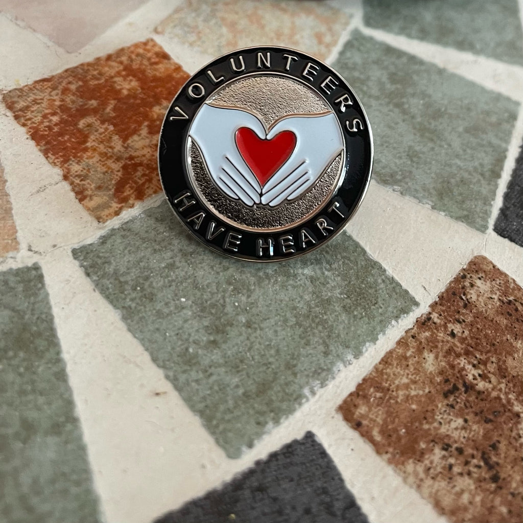 This is a solid metal circular pin badge which features a black border with gold text that reads 'VOLUNTEERS HAVE HEART' followed by an inner design of two hands forming the heart shape. A powerful image to represent their work and showing that their work does not go unnoticed.