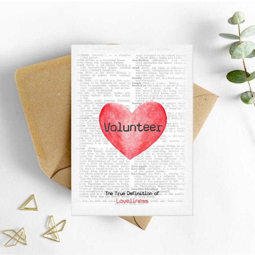 An A6 card with an illustrative heart design representing the heart of a volunteer featuring the sentiment 'The true definition of loveliness' layered over a dictionary print of love, loveliness.