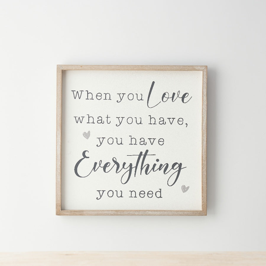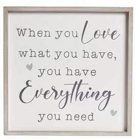 A charming boxed frame design with "when you love what you have, you have everything you need" quote. This item would add charm to any interior.