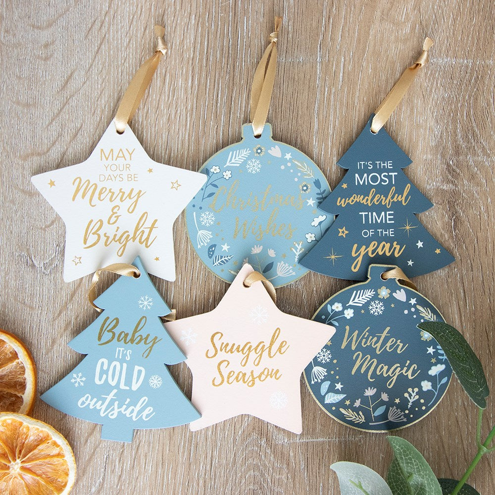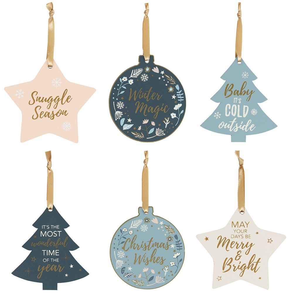 These beautiful festive shaped hanging Christmas tree decorations offer a touch of magical woodland charm for the festive season. Stunning shades of wintery blues, pale pinks and metallic gold offer a contemporary colour scheme to ensure a carefully curated Christmas tree look.